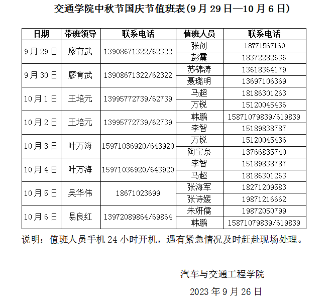 麻豆网 中秋节国庆节值班表(9月29日—10月6日)