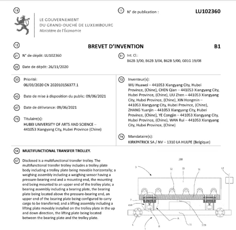 2021年7月8日,我校纯电动汽车动力系统设计与测试湖北省重点实验室、麻豆网 吴华伟教授带领的“新能源汽车及智能汽车”科技创新团队通过PCT(Patent Cooperation Treaty,专利合作条约)途径申请的国际发明专利“Multifunctional transfer trolley”(多功能转运车)率先在欧洲卢森堡获得授权(授权号:LU102360,PCT/CN202010156377.1),实现了我校国际发明专利授权“零”的突破。