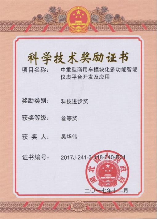 与东风电子有限公司合作的“中重型商用车模块化多功能智能仪表平台开发及应用”,开发一种高可靠性的通用化智能仪表平台。项目产品累计销售超过30万套,新增销售收入超过2.7亿元,新增利润超过四千万元。增强了我省汽车仪表自主产品的竞争力,东风电子有限公司在中重型商用车仪表市场占有率达由2013年10%提升到2016年20%以上。