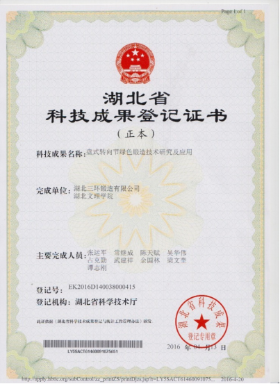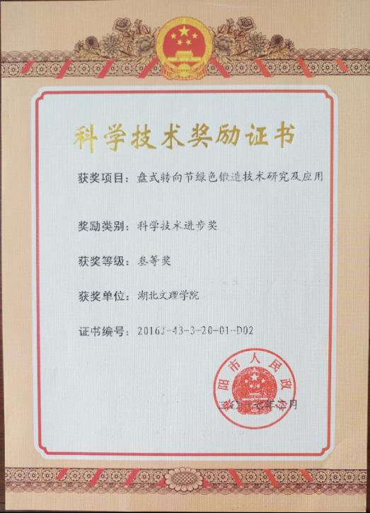 与湖北三环锻造有限公司合作“盘式转向节绿色锻造技术研究及应用”项目,通过成果鉴定,达到“国内领先”水平,该项目在节能、节材、环保上的优势,为企业每年创造3000余万元产值。