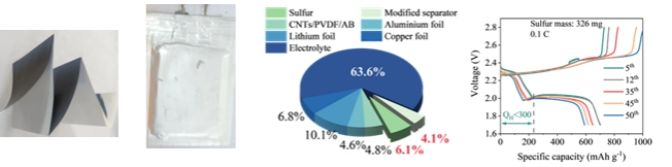 图1 基于阳离子掺杂改性的FeS2硫催化剂制造组装的软包电池及电池性能