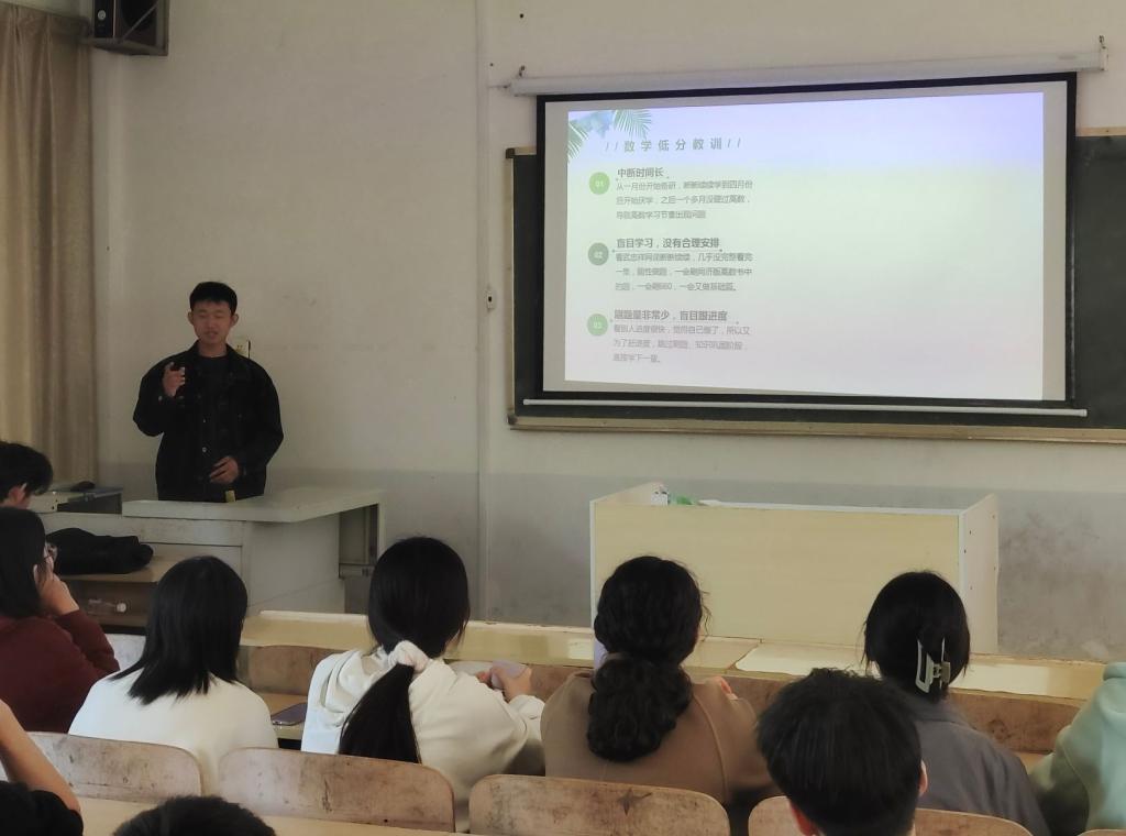 最后一位分享的是张谦,他从个人总结的经验和教训出发,他以自身数学成绩告诉同学们切忌三天晒鱼,两天打网的学习方式,为自己制定合适的学习计划,按照自己的节奏,不要被其他人的进度影响。在英语的复习中,张谦分享了墨墨背单词这个软件,告诉同学们背单词一定要坚持,注重时长和质量,并要保证真题的刷题量,根据自己的实际需要刷网课学习。最后他表示:要注意调整自己的状态,良好的心态以及快速调整心态的能力是考研上岸不可缺少的。