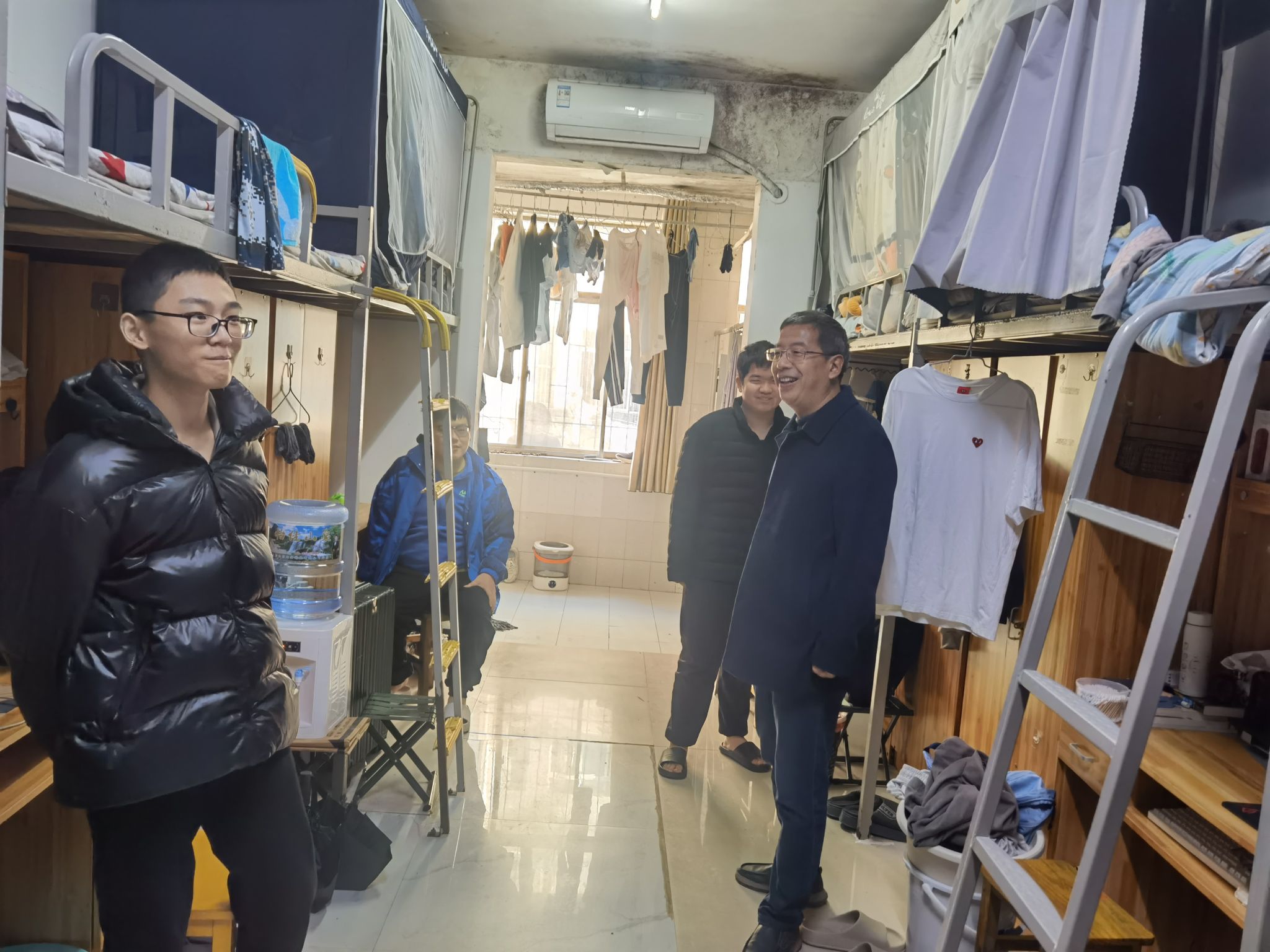 座谈会结束后,詹玉刚与马强老师前往交控2511班学生寝室开展实地走访。在走访过程中,詹玉刚书记与学生亲切交流,鼓励学生珍惜大学学习时光,夯实专业知识基础,积极参与专业实践活动,明确个人发展方向。