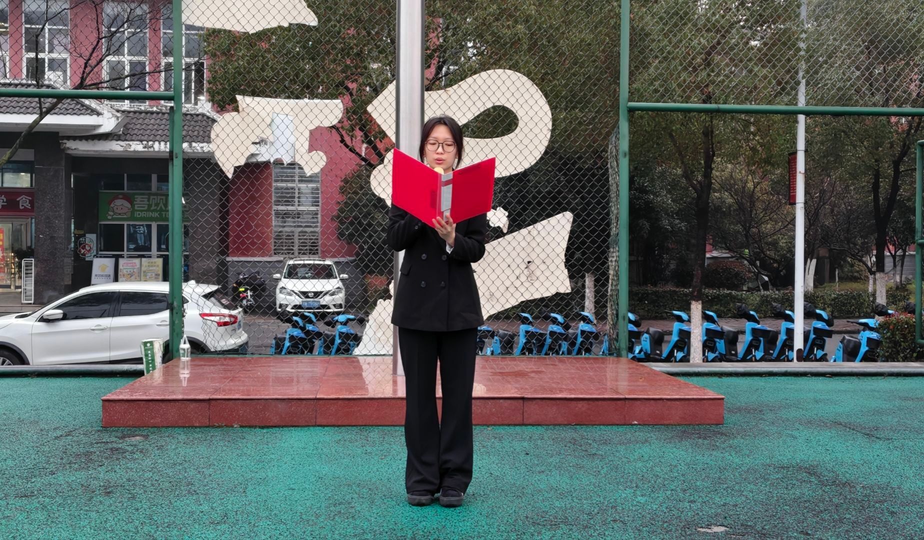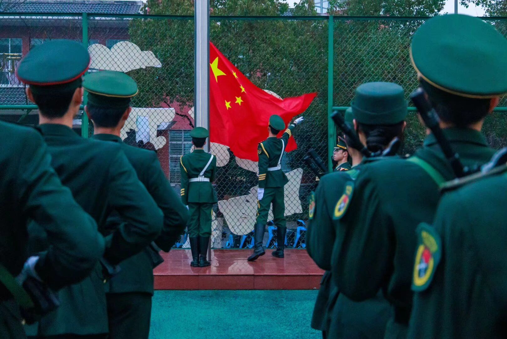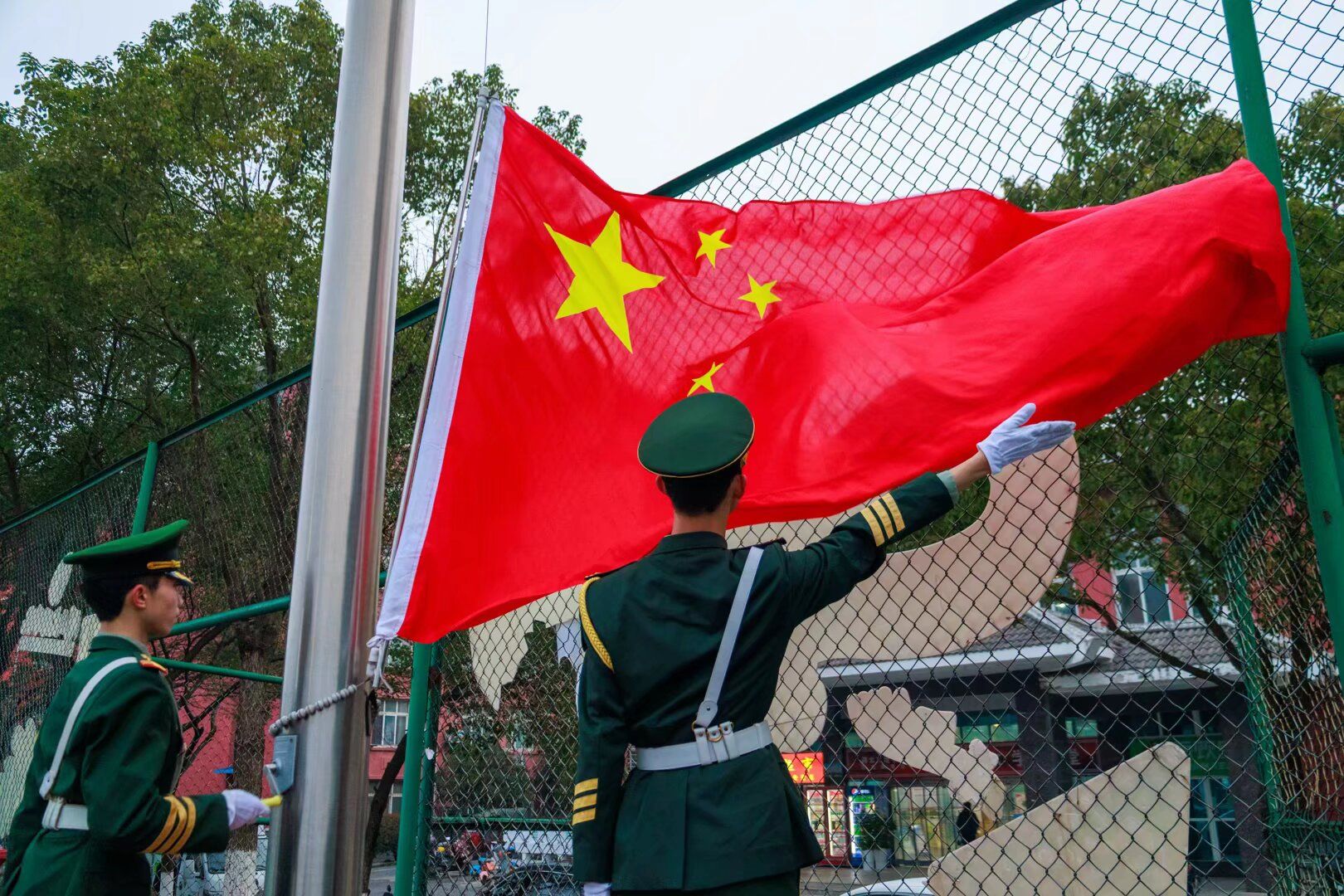 伴随着雄壮的《义勇军进行曲》,五星红旗冉冉升起,全体师生肃立行注目礼,齐唱国歌,仪式庄严肃穆。
