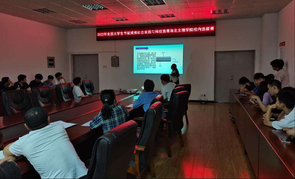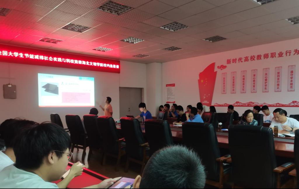 校内选拔赛在工科楼GW203举行。前期评审组根据校内参赛申报作品的创新性、完成度、文本质量、主题相关性等进行了初评,其中5项作品直接推选参加后期的节能减排国赛,其他作品需通过校赛答辩环节后决出剩余10个国赛参赛名额。答辩中,各参赛团队有5分钟讲解时间,主要展示作品的创新性及完成情况,现场老师进行现场提问、点评和打分。