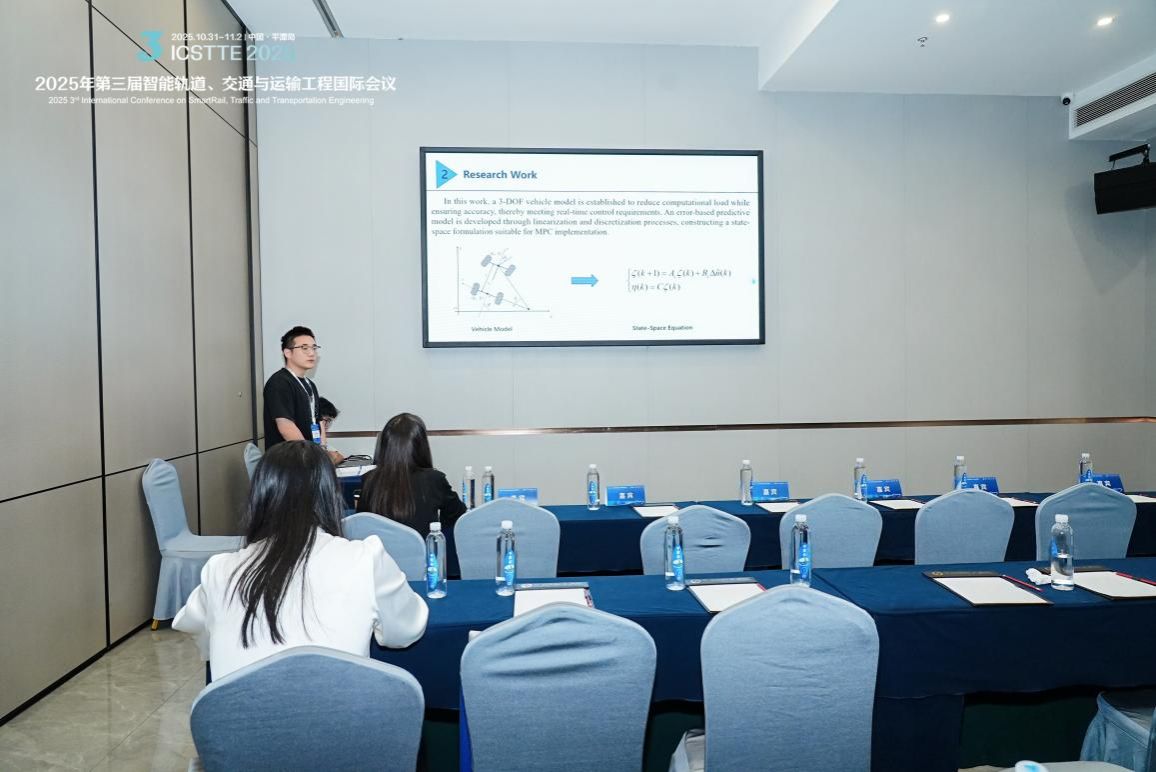 会议期间,我校研究生杜宇星在分会场作了题为“A Comparative Study of MPC Strategies for Distributed Drive Vehicle Trajectory Tracking”的报告,研究生韩亚恒在分会场作了题为“A Comparative Study of MPC Strategies for Distributed Drive Vehicle Trajectory Tracking”的报告,展示了我校在智能车辆控制与轨迹跟踪领域的研究成果。